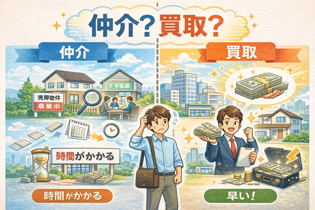 デメリット: 買い手が見つかるまで売れない(数ヶ月〜1年以上かかることも)。売却後に雨漏りなどのクレーム対応(契約不適合責任)のリスクがある。内覧のたびに部屋を片付け、対応しなければならない。