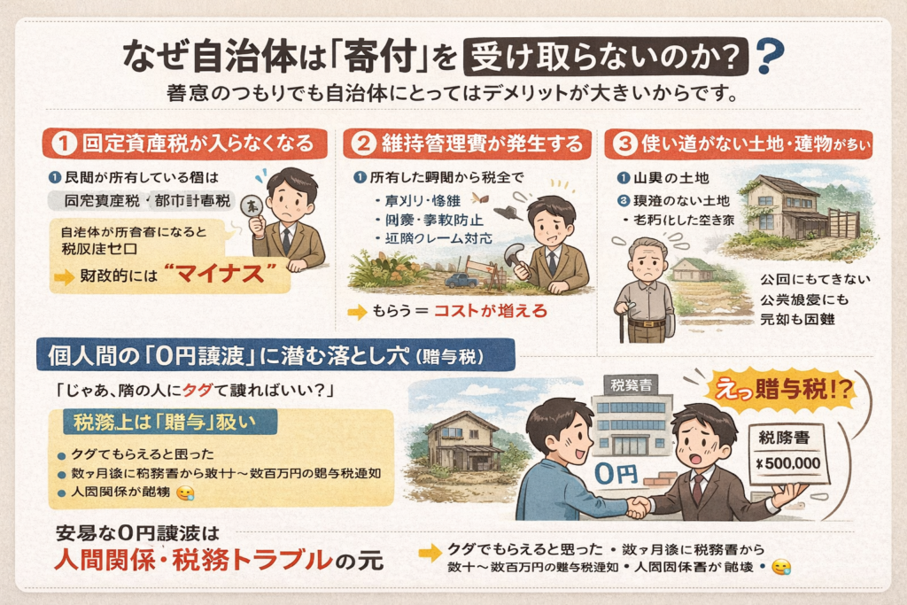 「公共のために使ってほしい」と申し出ても、ほとんどの自治体は寄付を受け付けません。理由はシンプルで、「自治体にとって『損』だから」です。